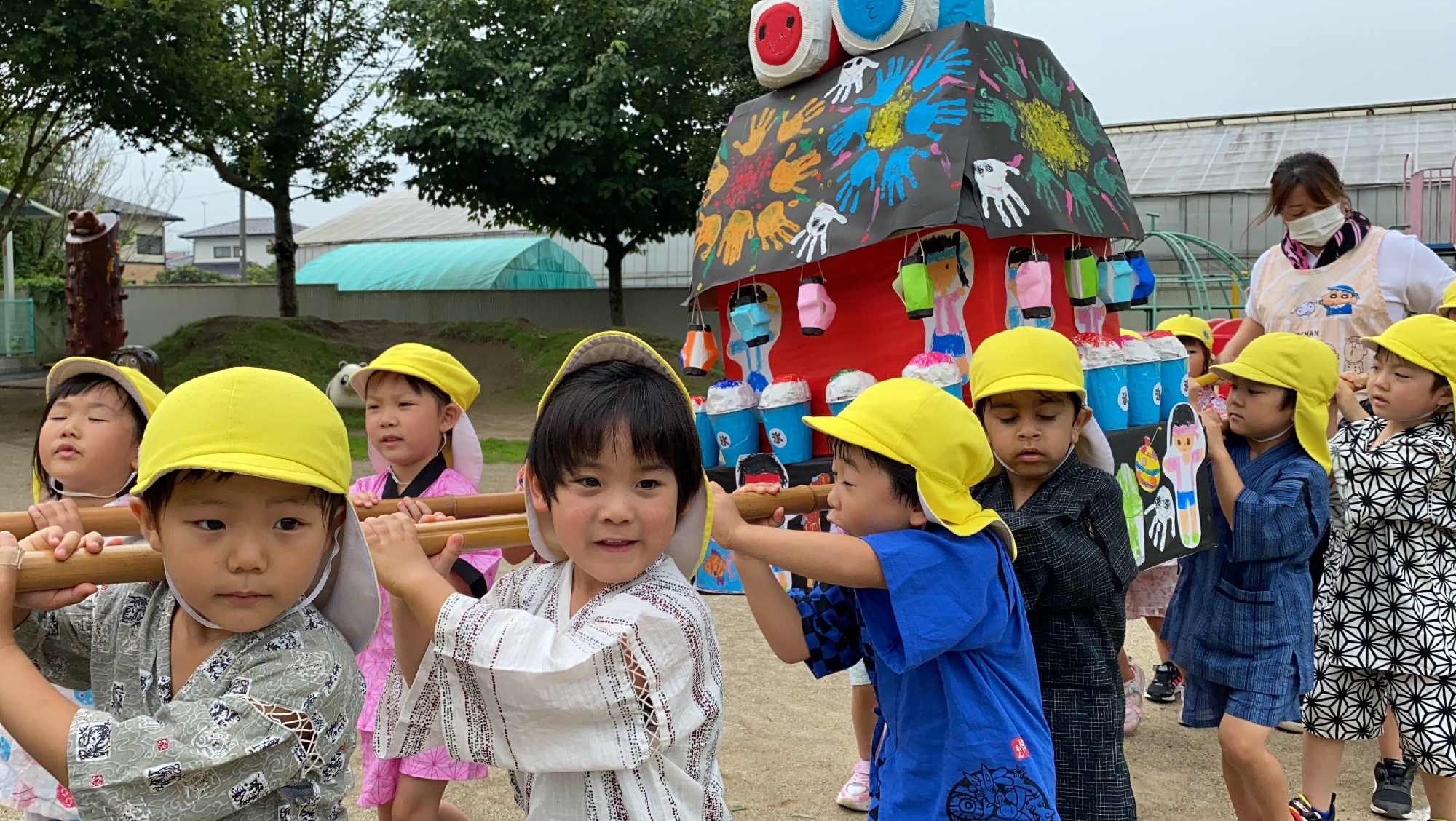 園庭ではみんなで集まり 盆踊りと お神輿をワッショイ!ワッショイ!と 担ぎました。